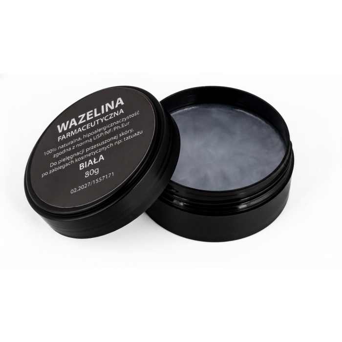Wazelina biała, tak chętnie używana w kosmetyce. Warto wiedzieć, że ten produkt nie wchłania się przez skórę ani błonę śluzową, dlatego nie wywołuje podrażnień i uczuleń. Pozostaje na skórze, tworząc warstwę ochronną, jednocześnie świetnie nawilżając cerę.