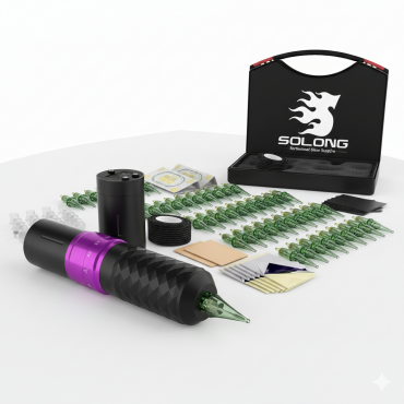Cały zestaw z maszynką na baterie typu Pen do tatuażu.